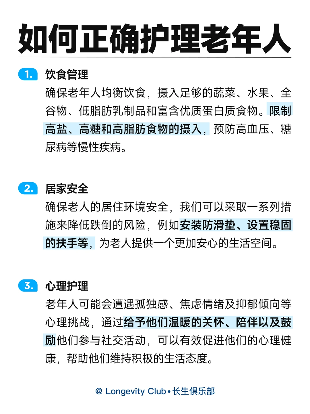 确保老年人均衡饮食,摄入足够的蔬菜、水果、全谷物、低脂肪乳制品和富含优质蛋白质食物。限制高盐、高糖和高脂肪食物的摄入,预防高血压、糖尿病等慢性疾病。