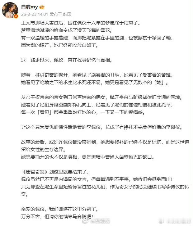 唐宫奇案之青雾风鸣 我的评分:白鹿长文告别唐宫奇案李佩仪白鹿告别唐宫奇案李佩仪 白鹿发长文告别👖唐宫奇案李佩仪,一字一句都透露了对角色的喜爱与不舍啊,还好这个清醒又强大的李佩仪一直会在我们观众的心里!!