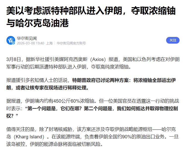 3月8日,据新华社援引美媒阿克西奥斯(Axios)报道:美国欲夺取伊朗重要岛屿