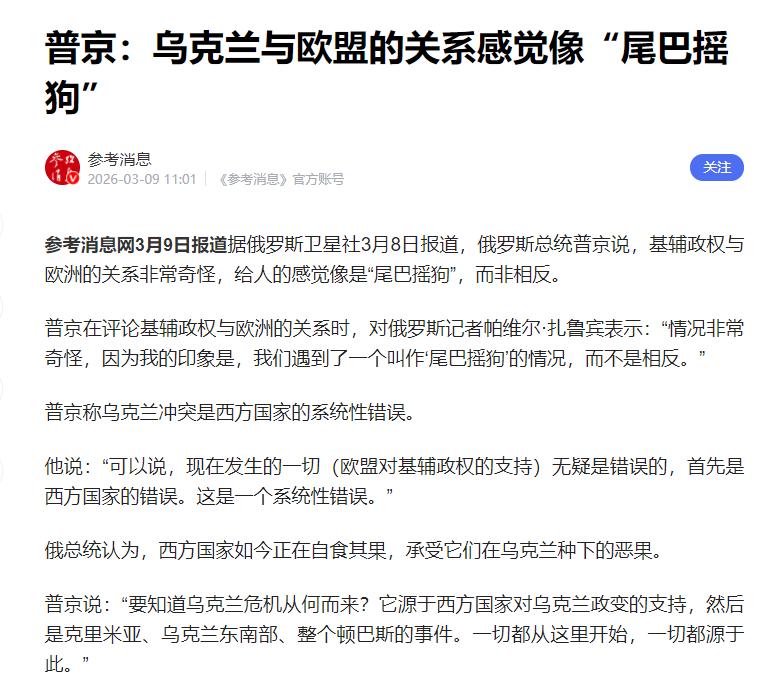 普京直言:基辅政权是“尾巴摇狗”,欧洲被自己援助的对象绑住了