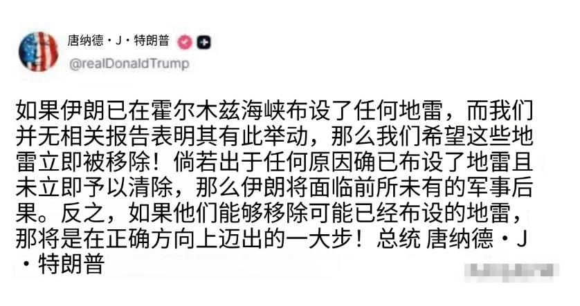 有消息说,伊朗已经开始在海峡布水雷了,现在规模不大,但能快速布几百枚。特朗普看到这苗头,才放狠话警告,还说美军已经毁了10艘伊朗布雷的船,就是要给伊朗下马威。