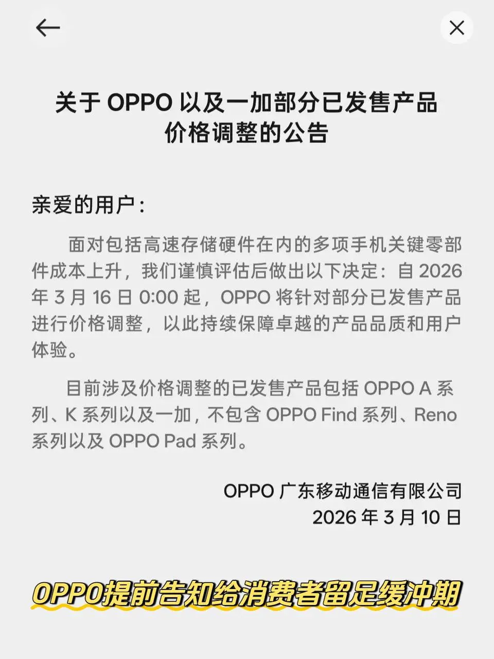 在这种全行业涨价的背景下,OPPO也扛不住了😭官宣3月16日0点起部分机型调价,包括A系列、K系列和一加,Find、Reno和Pad系列暂不调价✅说实话OPPO这波真的挺厚道👏提前6天预告!给足缓冲期!不像有些品牌悄悄咪咪就涨了,想入手的朋友可以抓紧最后这一波6天的窗口期!