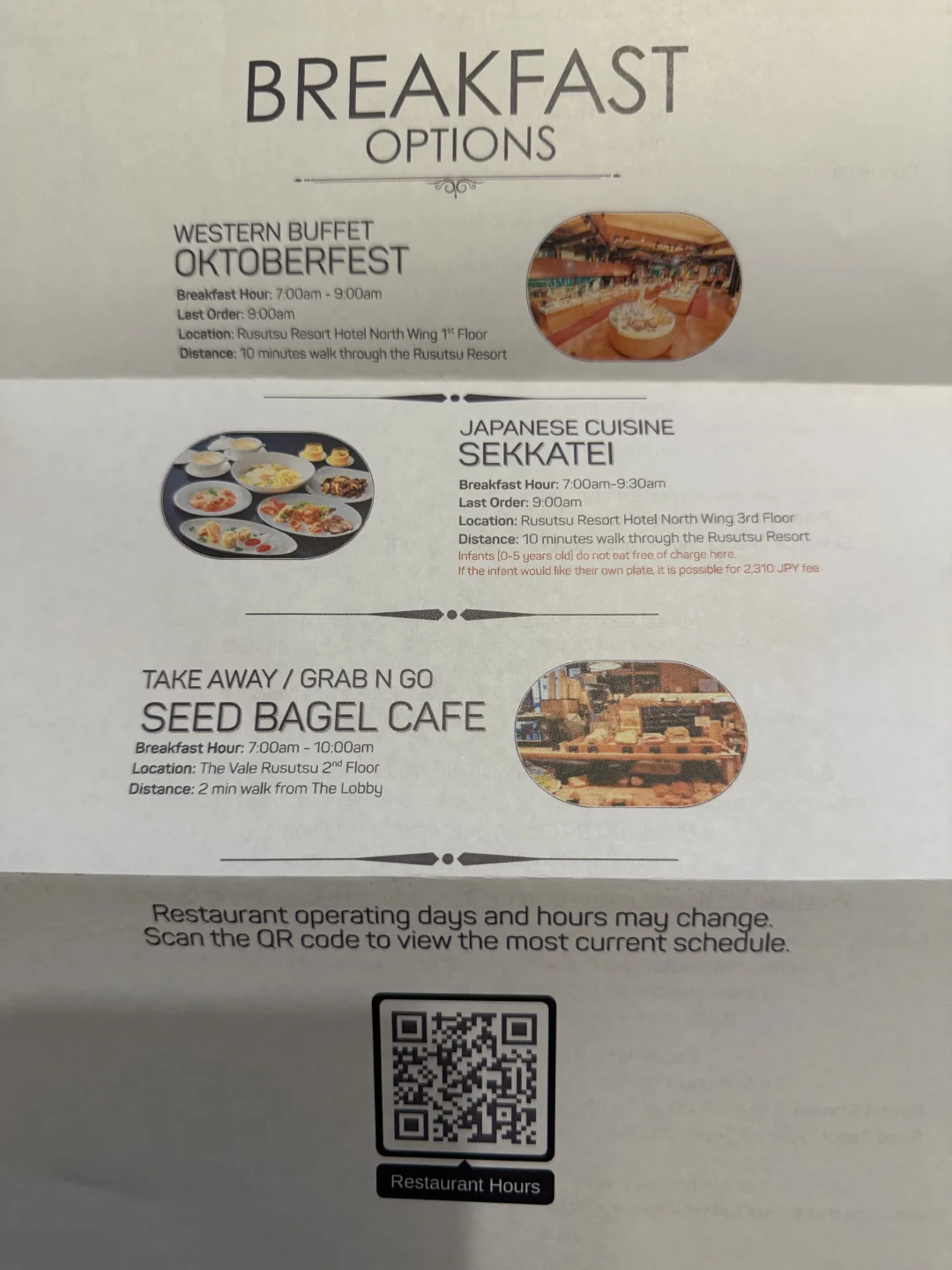 3. 早餐三种选择:Rusutsu的自助早餐OKTOBERFEST(图9)和日料定食SEKKATEI(图10)以及Vale lobby旁的SEED BAGEL。自助早餐种类丰富但最多两顿就腻(南瓜沙拉 黑豆米饭配咖喱酱汁巨好吃);日料定食吃一次足矣很清淡健康;Vale自己的早餐看似简单量少但很管饱 三明治很不错;我待的6天基本吃的比较多的就是OKTOBERFEST和SEED BAGEL;