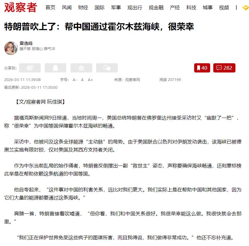 特朗普再一次让我大开眼界!据福克斯新闻网9号报道:美国总统特朗普在佛罗里达州接受采访,被问到霍尔木兹海峡的情况时,竟然大言不惭地说,他“很荣幸”能帮中国等国家,保障这条海峡的畅通。这话听着好听,其实全是套路,咱们慢慢说,大家一看就明白。