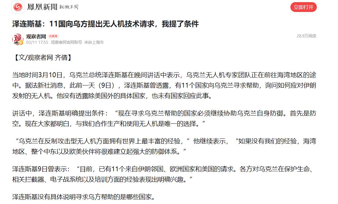 到了3月10号晚上,泽连斯基又在晚上的讲话里补充了消息,说乌克兰的无人机专家,已经在去海湾地区的路上了,就是去给那些求助的国家帮忙的。