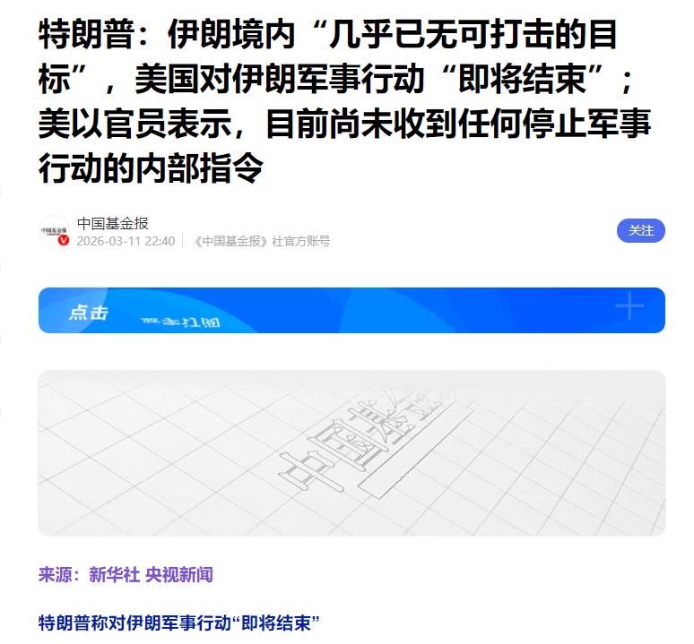 当地时间3月11号,央视记者从伊朗发回消息,美国总统特朗普公开说,伊朗境内几乎没什么可打击的目标了,美国对伊朗的军事行动很快就要结束。