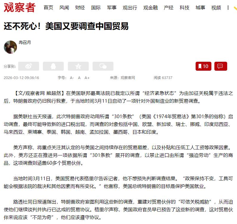 按说被判违法就该收敛,可特朗普政府偏不,当地时间3月11号,又启动了新的贸易调查,专门查外国的制造业,这次用的是美国的“301条款”,大家不用记全名,就知道这是美国的手段,想查哪个国家贸易,觉得不满意就能加税就行。
