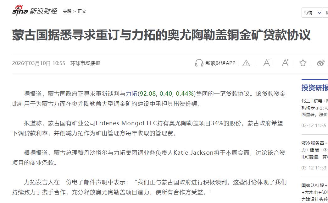 就在3月10日,蒙古政府又逼着全球矿业巨头力拓重新谈奥尤陶勒盖铜金矿的合作,想让对方多给分红。