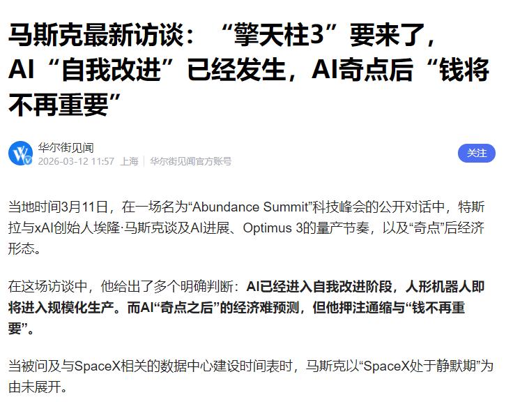 马斯克最新访谈:擎天柱3今夏量产,AI能自己进步,以后钱可能没用了