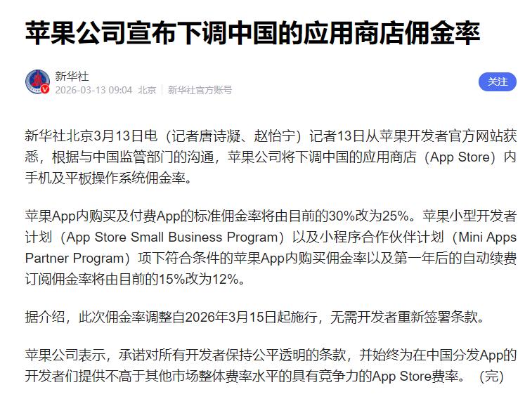 从2026年3月15日开始,苹果应用商店的佣金率就调整了,不用做App的人重新签协议,到时候自动生效,不用额外操作。