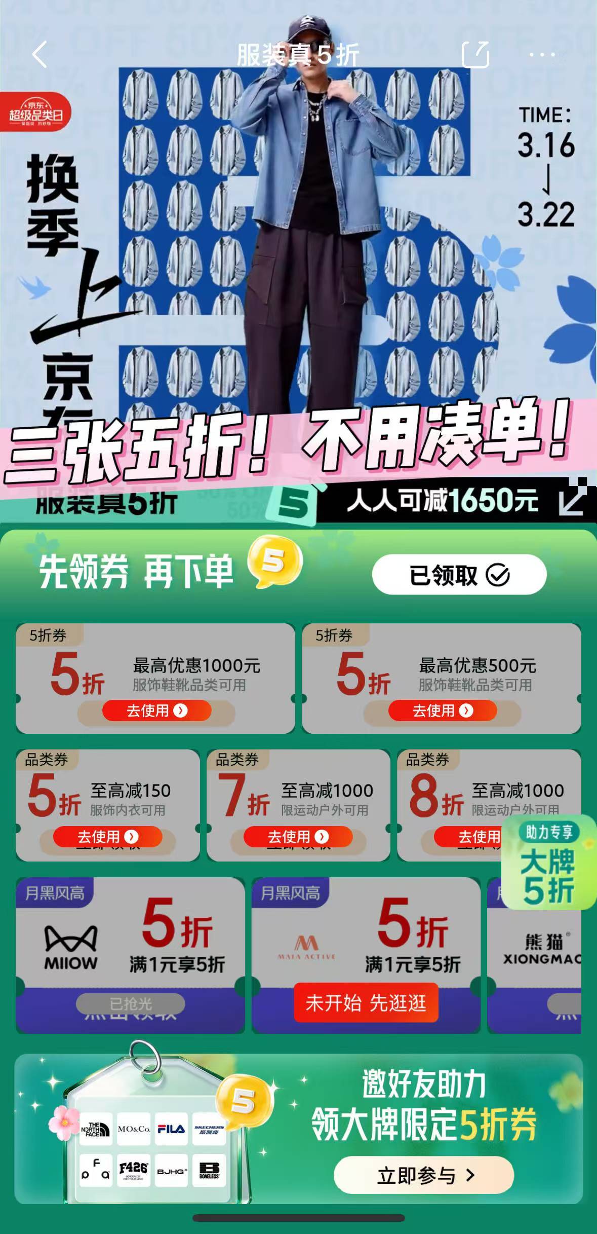 真的被京东服装真5折又又又来了 硬控住了!!3月16日0点-3月22日24点,7天时间,戳【网页链接】每人能领3张5折券,最高立减1650元!1000+品牌、上千万件商品,统统1件5折!不用凑单、满1元也5折!我算了一下,一套春日look原价1000+,5折直接省出一顿火锅,从衬衫、连衣裙、薄外套到冲锋衣、防晒衣、运动鞋,甚至连童装都包了!!更绝的是春季新款也参加???这波不冲真的会后悔一整年!!换季上京东,服装真5折,现在就分享活动页面让好友助力,还能获得稀缺大牌的5折,FILA、斯凯奇、北面、edition、MO&Co、FPA、FDR、瞬时山野等全都能安排,换季衣橱就靠这波了!!京东服装你是会劝的