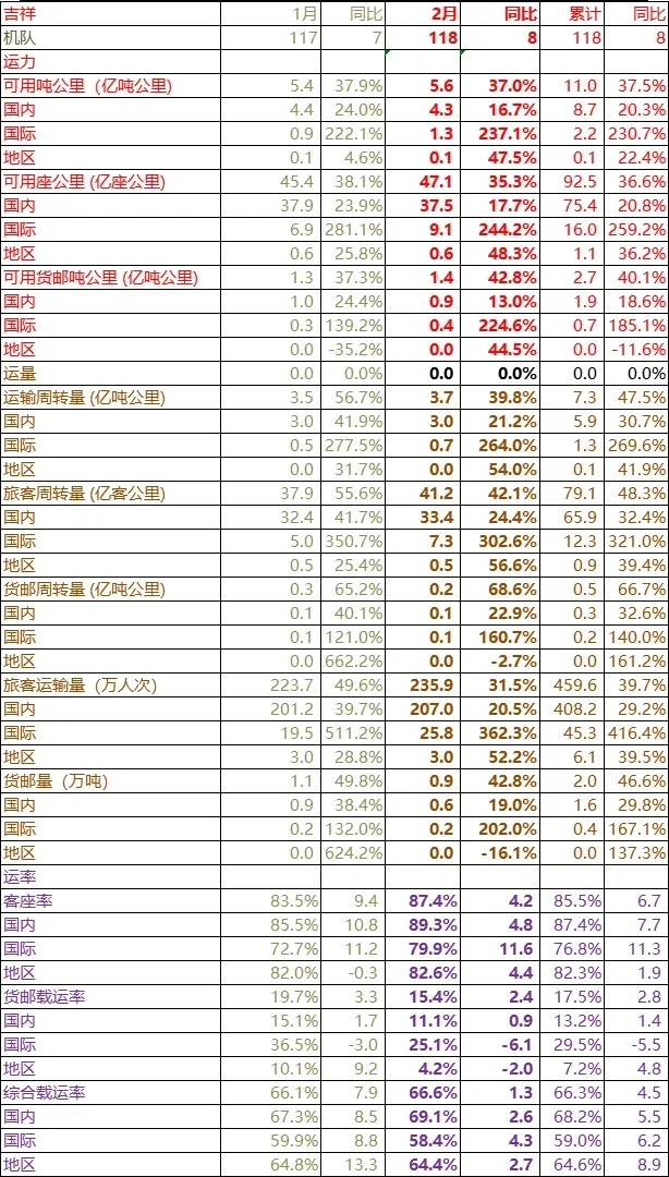 根据吉祥航空发布的2024年2月份生产数据显示: