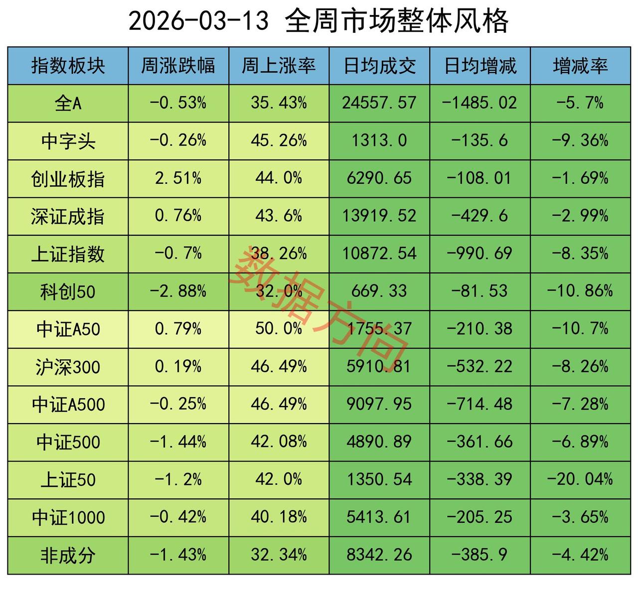 本周,全A指数跌幅0.53%,个股上涨率35%,日均成交2.46万亿,较上周缩量6%。