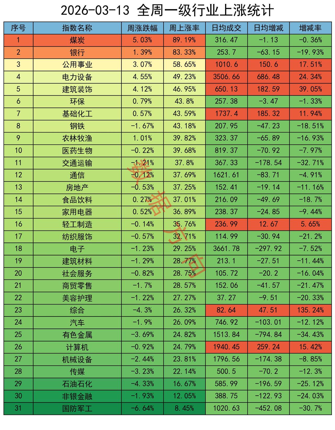 其中,煤炭、银行、公用事业、电力设备、环保、基础化工、农林牧渔,这7个行业都是连续两周打榜。