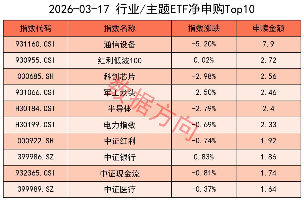 通信设备指数(7.9亿),获最多净申购。昨天几只龙头跌速快、跌幅大,卖不赢,不排除申购成ETF往外出的可能性。