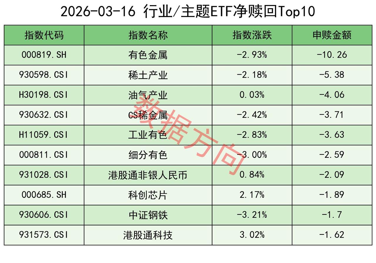 有色金属指数(-10.26亿)、稀土产业指数(-5.38亿)、油气产业指数(-4.06亿)、CS稀金属指数(-3.71亿)、工业有色指数(-3.63亿)、细分有色指数(-2.59亿)、中证钢铁指数(-1.7亿),一起进入赎回榜。