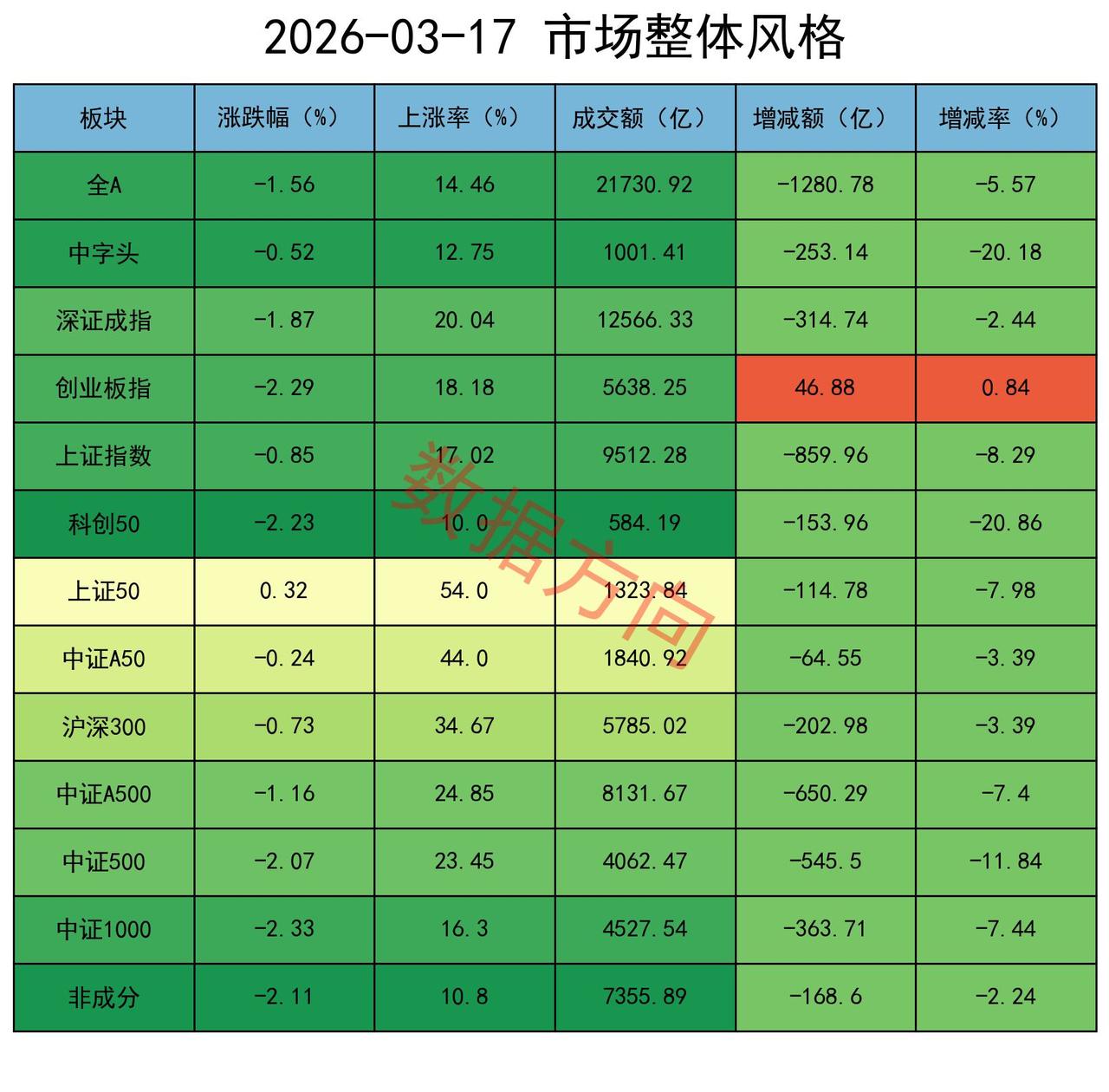 大盘全天震荡下跌,全A指数跌幅1.56%,仅有银行、非银、地产等少数行业逆市上涨,多数行业在下跌,科技、高端制造、大宗商品方向跌幅居前,个股上涨率只有14%,成交额较昨天缩减6%。