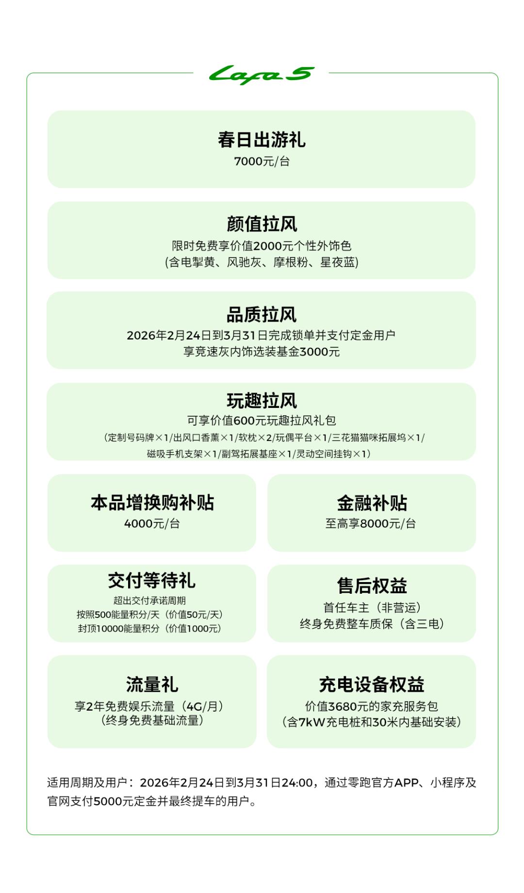 而且现在不是很多品牌都“卷”不下去了嘛,结果我看车主群里面在说,零跑3月份又有了新的开春优惠,最高能省46000元。我专门看了一下我的Lafa5,要是3月买的话,除了直接有7000元的现金优惠,从外观到内饰的选装那都有补贴,甚至是能限时免费享,甚至金融、增换购等等的补贴也全都有了,好而不贵,那叫一个稳。这有点儿技术在身上,就是有底气。