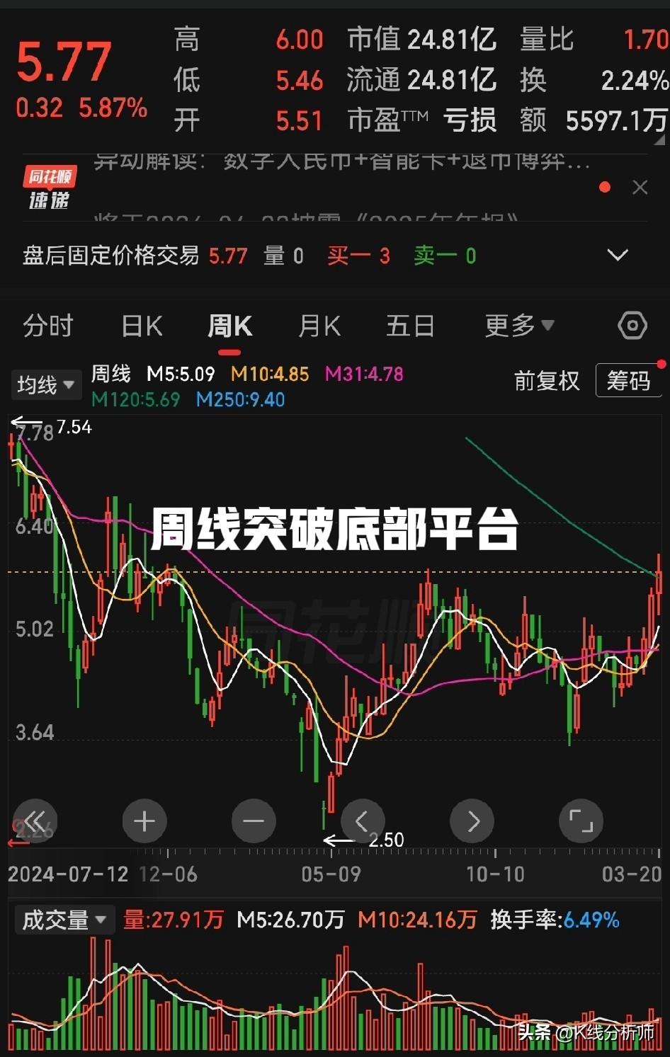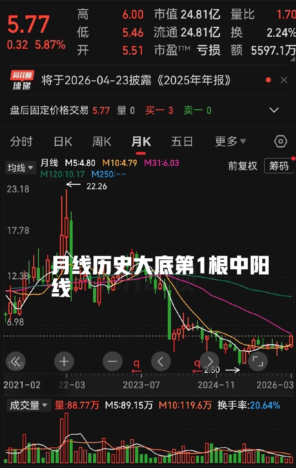日线历史底部刚刚翘头,周线突破底部平台,月线历史大底第1根中阳线。