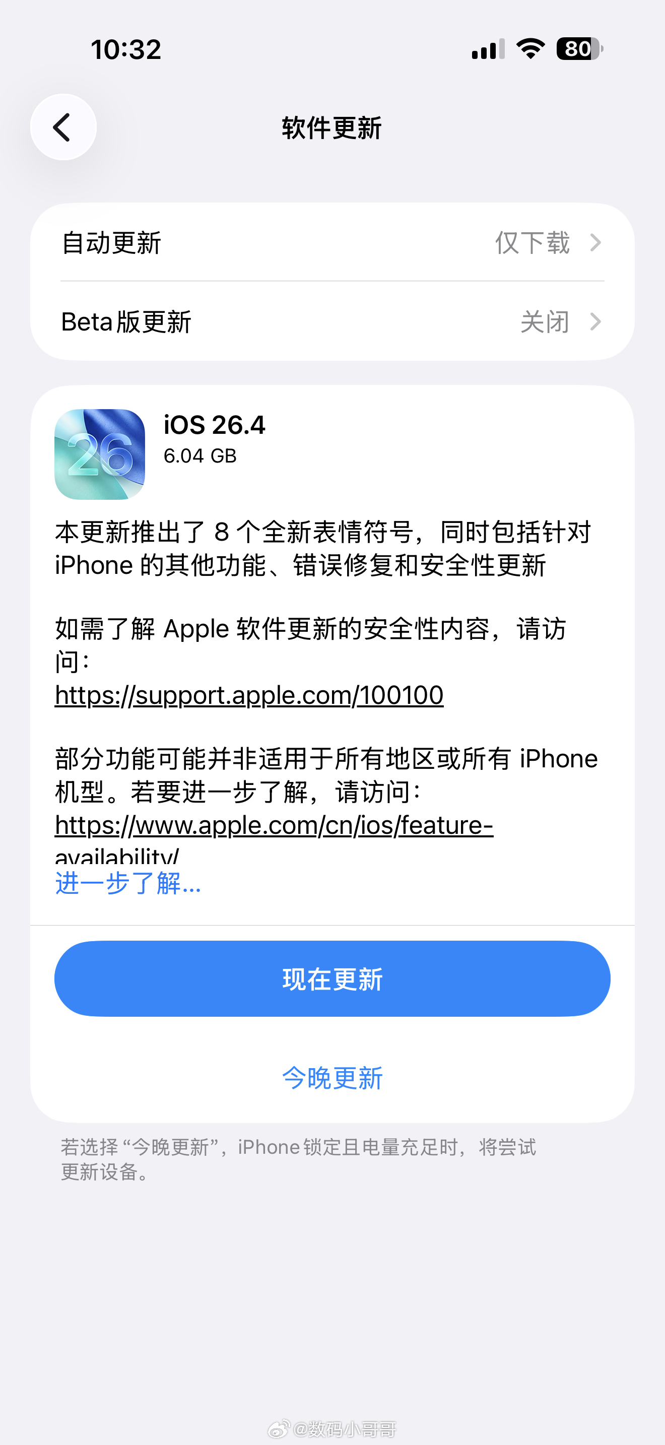 苹果发布iOS26.4正式版推送了,更新包足足6.04GB,更新的内容还挺多的。小哥哥先更为敬,好用的新功能晚点再跟大家详细分享~