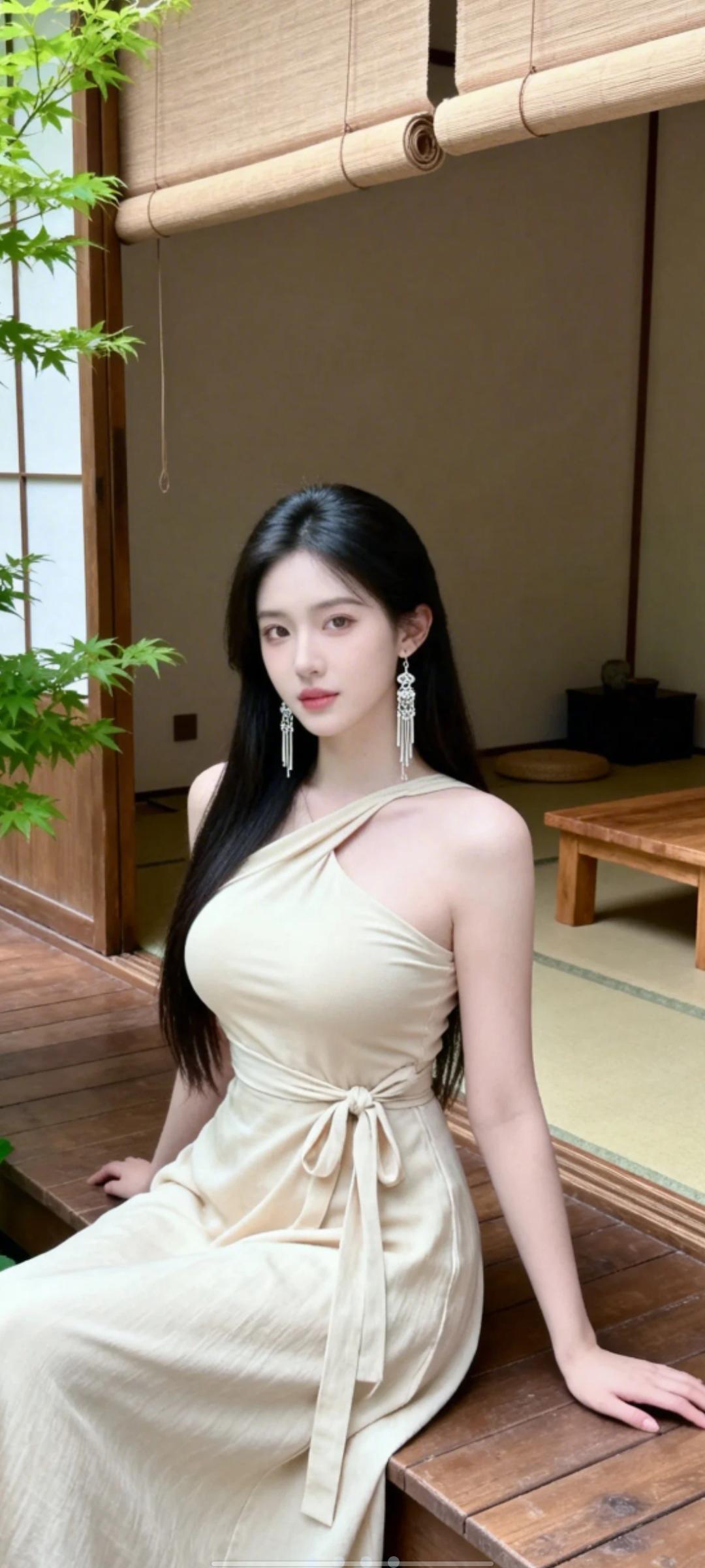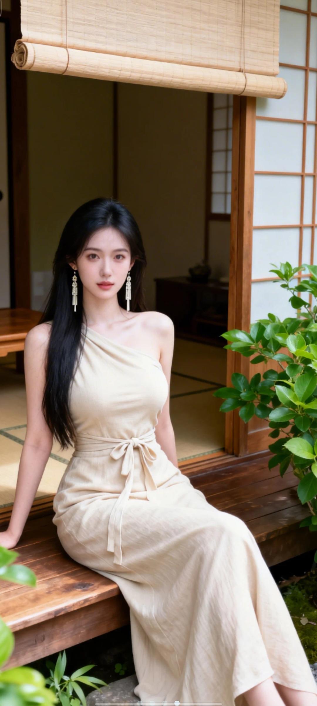 在传统日式庭院中,优雅女子静坐,感受宁静与美丽。