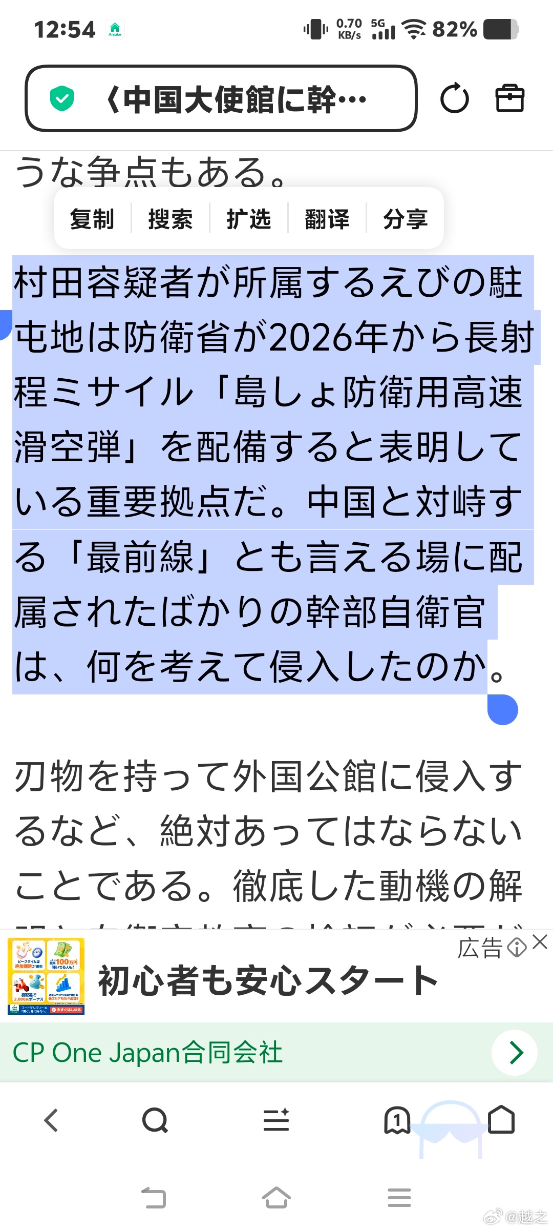 多重乱象下的日本这个携带利刃闯入中国大使馆的村田晃大三等陆尉所属虾岛驻扎地,是日本防卫省表示将从2026年开始部署远程导弹“岛屿防卫用高速滑翔弹”的重要据点。显然对中国的教育认识是有准备,先行的。 现在又出来说,这次宣传被中国占先了,中国对外报道说是带刀要杀害中国外交官。中国抓了他之后,三个半小时,才交给日本方面。到了警视厅那边,这罪犯改口说是要和大使谈谈,要求中国不要再对日本说狠话,不听我就自杀。意思是带刀进中国大使馆去不是去杀中国外交官的,是要去胁迫自杀的。集英社这稿子说,中日之间的发表不同,中国先说了,所以国外都按照中国的报道了。被中国宣传占先了。这意思是中国故意抹黑日本,夸大事实。还有不少日本右翼留言开始埋怨中国,说是中国对日本一直追及日本的错误,才导致日本多了这么多右翼。真是滑稽。从中也可看出日本人的逻辑,都是你们的错,你们逼的。偷袭珍珠港也是你们逼的。我进入中国侵略,是因为你们不让我们经济侵略,是你们逼的。 还有脑洞清奇的,要求查查他有没有中国老婆中国情人,认为是中国这边的圈套阴谋。所以日本右翼真的不是能够理解的。