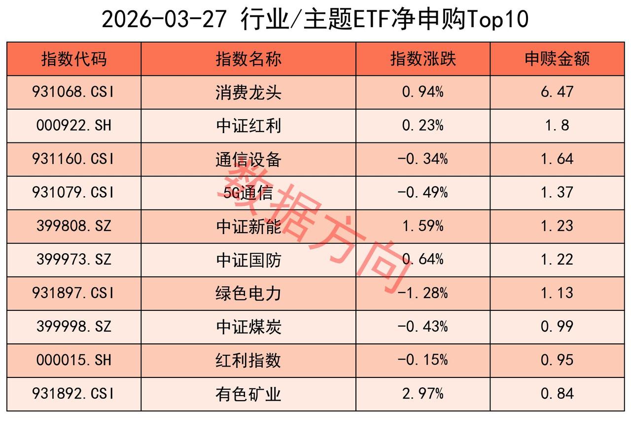 其他进入申购榜的还有:消费龙头指数(6.47亿)、中证国防指数(1.22亿)、有色矿业指数(0.84亿)。