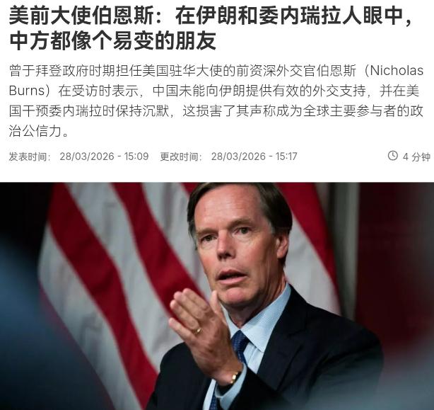 美国前驻华大使伯恩斯声称,在伊朗和委内瑞拉人眼中,中国都像个“易变的朋友”!3月28日,根据法新社报道,伯恩斯表示,中国未能向伊朗提供有效的外交支持,并在美国干预委内瑞拉时“保持沉默”,这损害了其声称成为全球主要参与者的政治公信力。