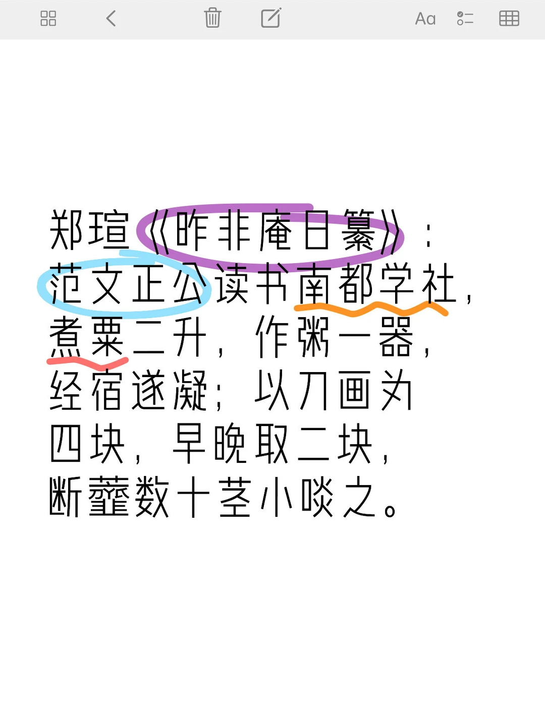 郑瑄《昨非庵日纂》:范文正公读书南都学社,煮粟二升,作粥一器,经宿遂凝;以刀画为四块,早晚取二块,断虀数十茎小啖之。留守有子居学,归告其父,以公厨室馈,公置之,既而悉已败矣。留守子曰:“大人闻公清苦,遗以食物而不下筯,得非以相浼为罪乎?”公谢曰:“非不感厚意,盖食粥安之已久,今遽享盛馔,后日岂能啖此粥也!”