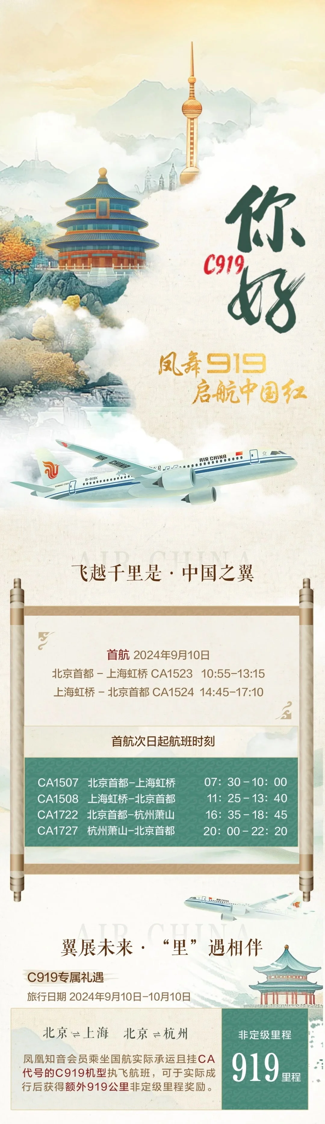 据悉,9月11日起国航C919将执飞北京首都-上海虹桥/杭州两条航线。