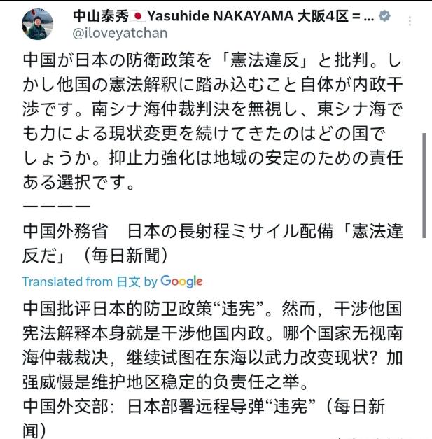 中山泰秀这句话完全是颠倒黑白、胡搅蛮缠,他故意混淆概念,把日本违反和平宪法的行为说成是内政,还倒打一耙指责中国,说白了就是想为日本部署远程导弹找借口,掩盖其破坏地区稳定的真实目的。