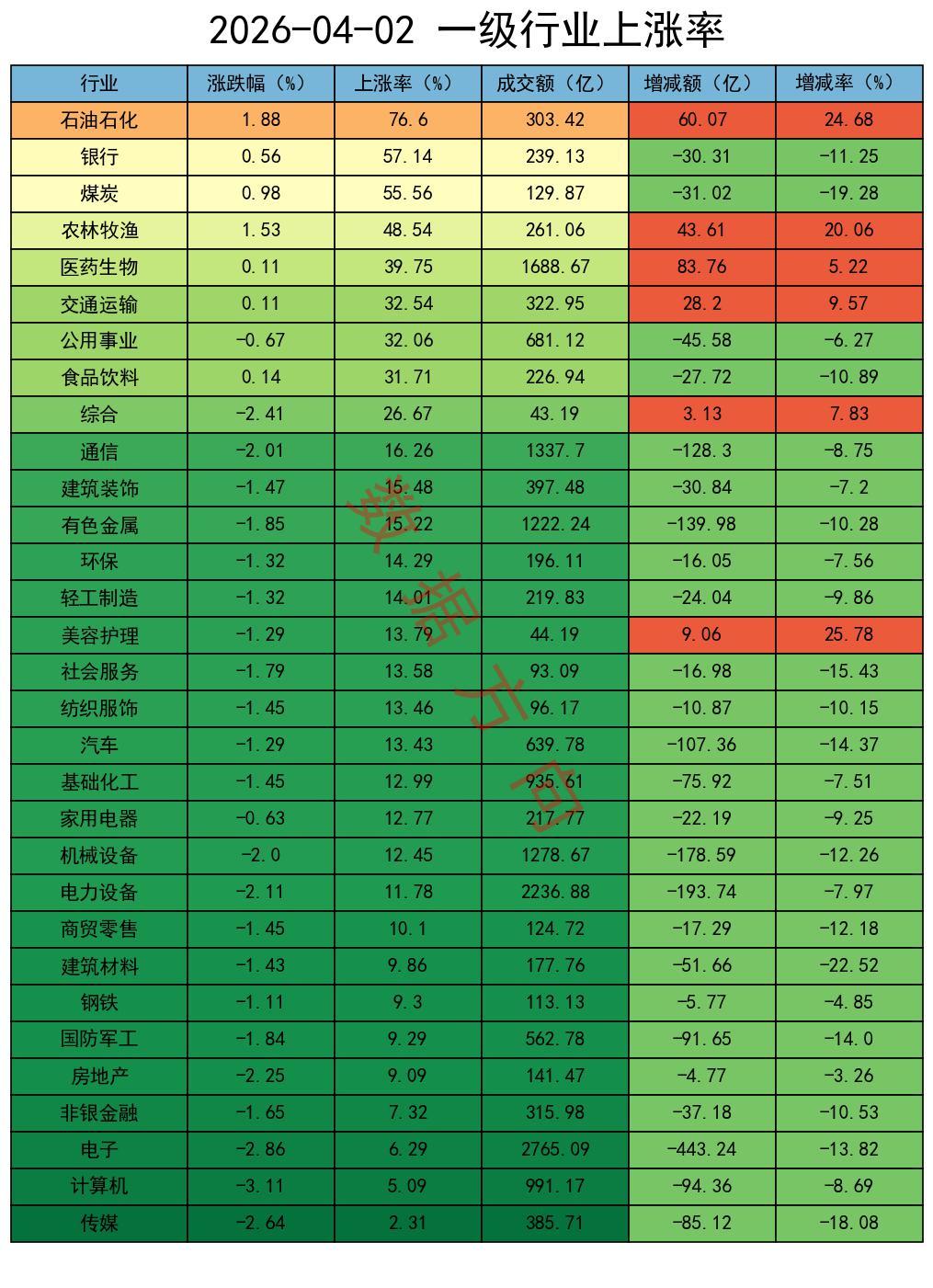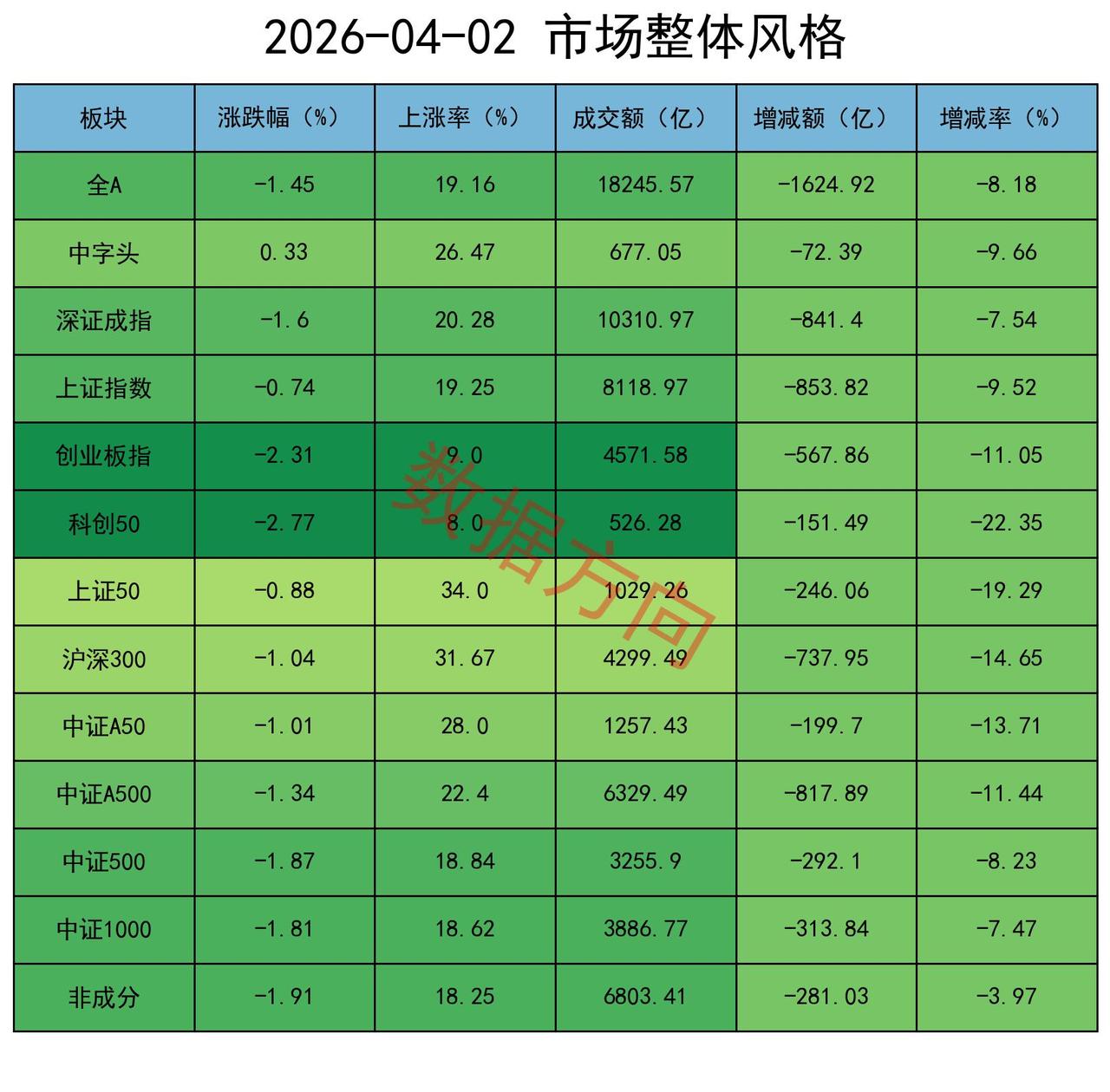 大盘低开低走、震荡下行,全A指数跌幅1.45%,仅有石油石化、农林牧渔、煤炭、银行等少数行业逆市上涨,其他行业多数下跌,个股上涨率为19%,成交额只剩1.8万亿,大幅缩减8%。