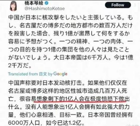 右翼作家桥本琴绘就在这时候跳出来,假设中国对日本城市扔核弹,然后煽动“一亿日本人奋起反击”。这一唱一和的,不就是想制造紧张空气,为他们突破“无核三原则”、搞核武装找借口吗?