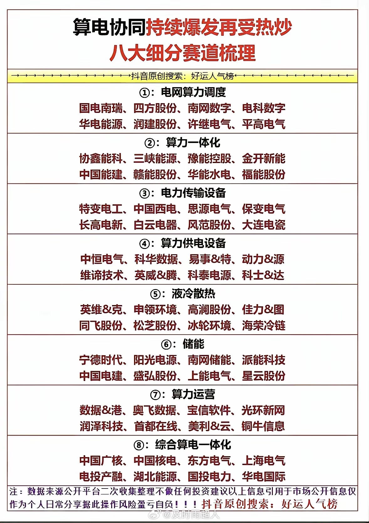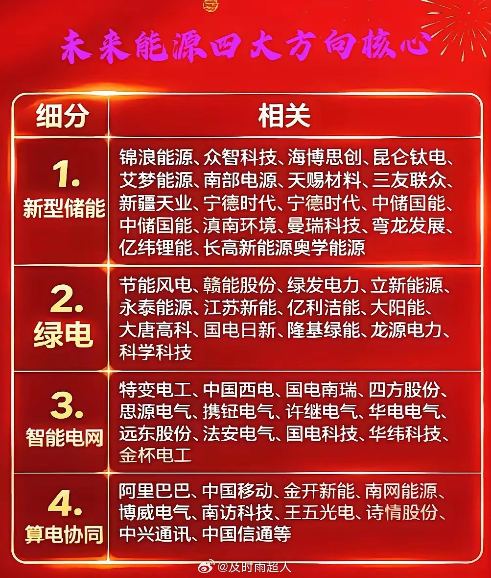 国家战略部署未来能源四大方向核心,共同构成了新型电力系统的“四梁八柱”:新型储能负责“存电”;绿电负责“发电”;智能电网负责“送电”;算电协同负责“用能优化”。它们彼此联动、协同发展,不仅是能源转型的核心引擎,更是未来十年最具潜力的产业投资方向。国家战略!