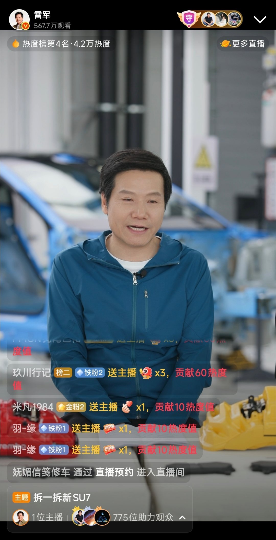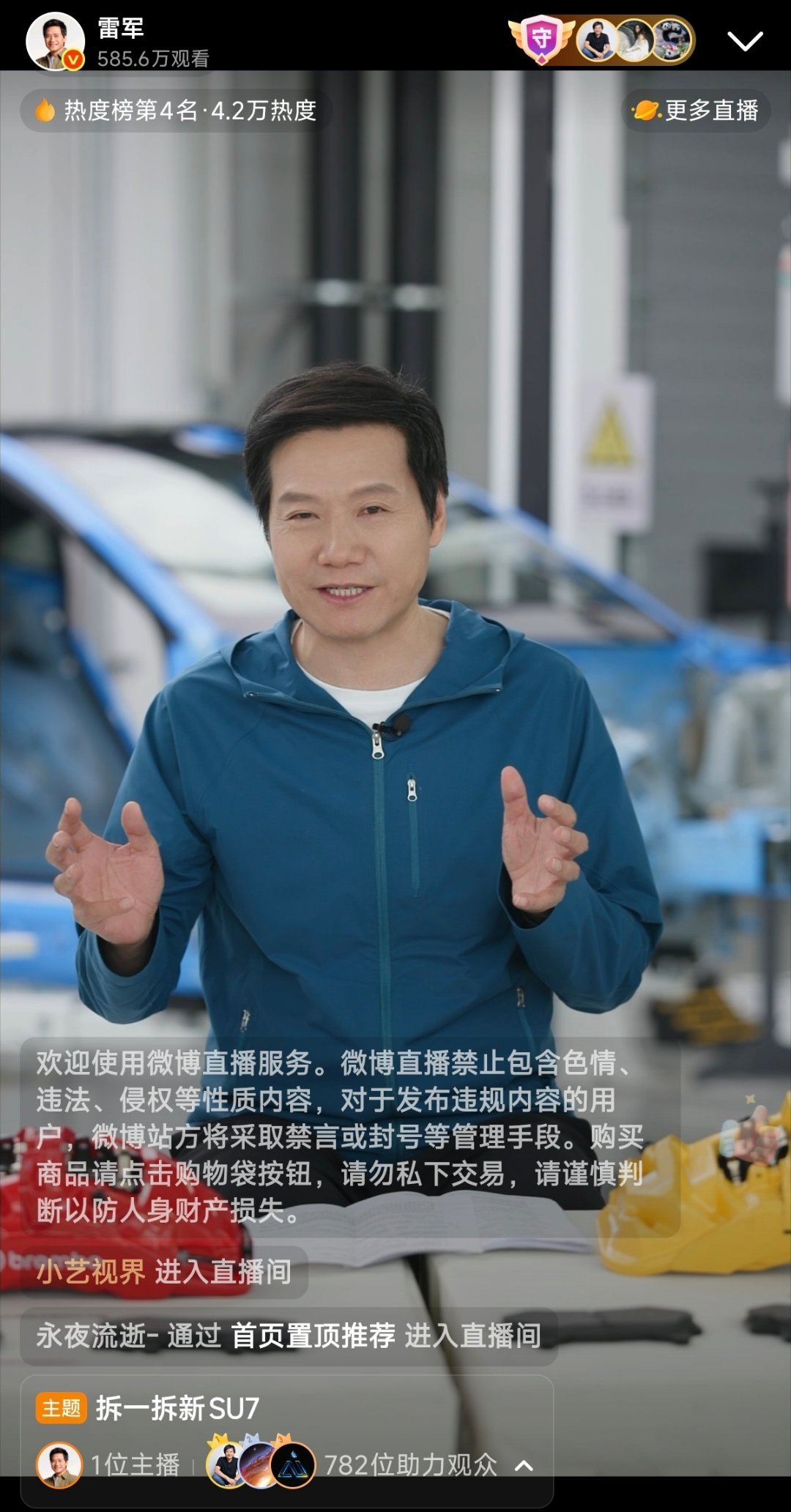 昨天雷总直播拆车,快结束时,截了几张图,身材管理的真不错。