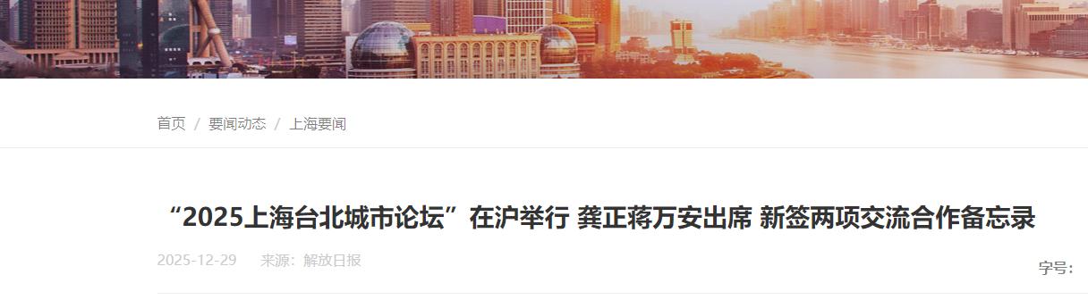 信息来源:《“2025上海台北城市论坛”在沪举行 龚正蒋万安出席 新签两项交流合作备忘录》,解放日报,2025年12月29日。