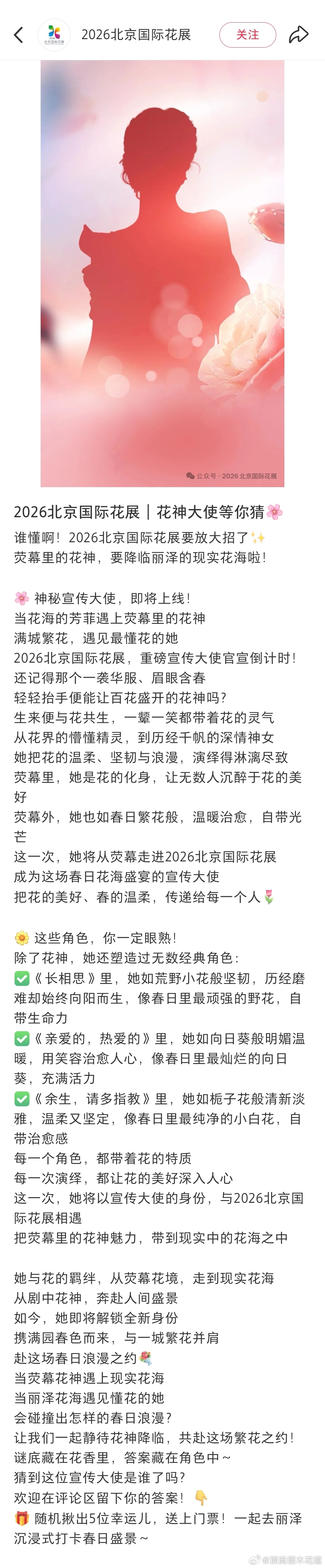 来猜人,2026北京国际花展花神大使该说不说杨紫真的和花很有缘香蜜沉沉烬如霜里面她的真身是霜花(和花字也沾边了)生命树里面名字是白菊玉兰花开君再来剧名带玉兰花 沉香如屑里面她是菡萏 国色芳华里面她是牡丹