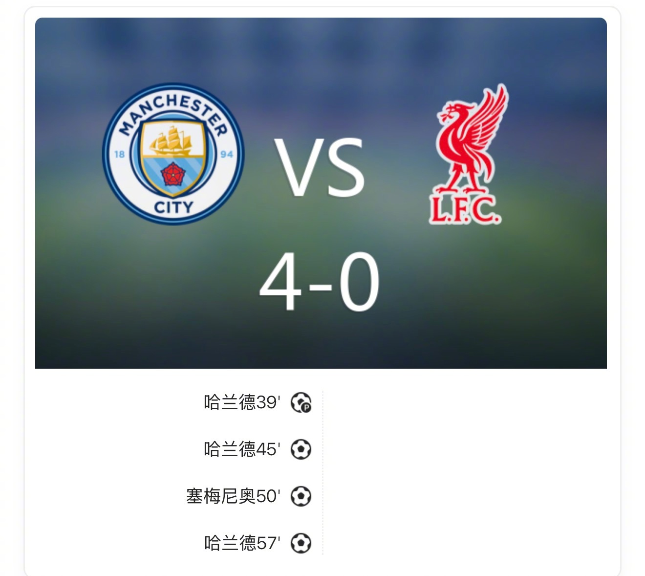 战报:曼城4-0利物浦,哈兰德戴帽,萨拉赫失点!