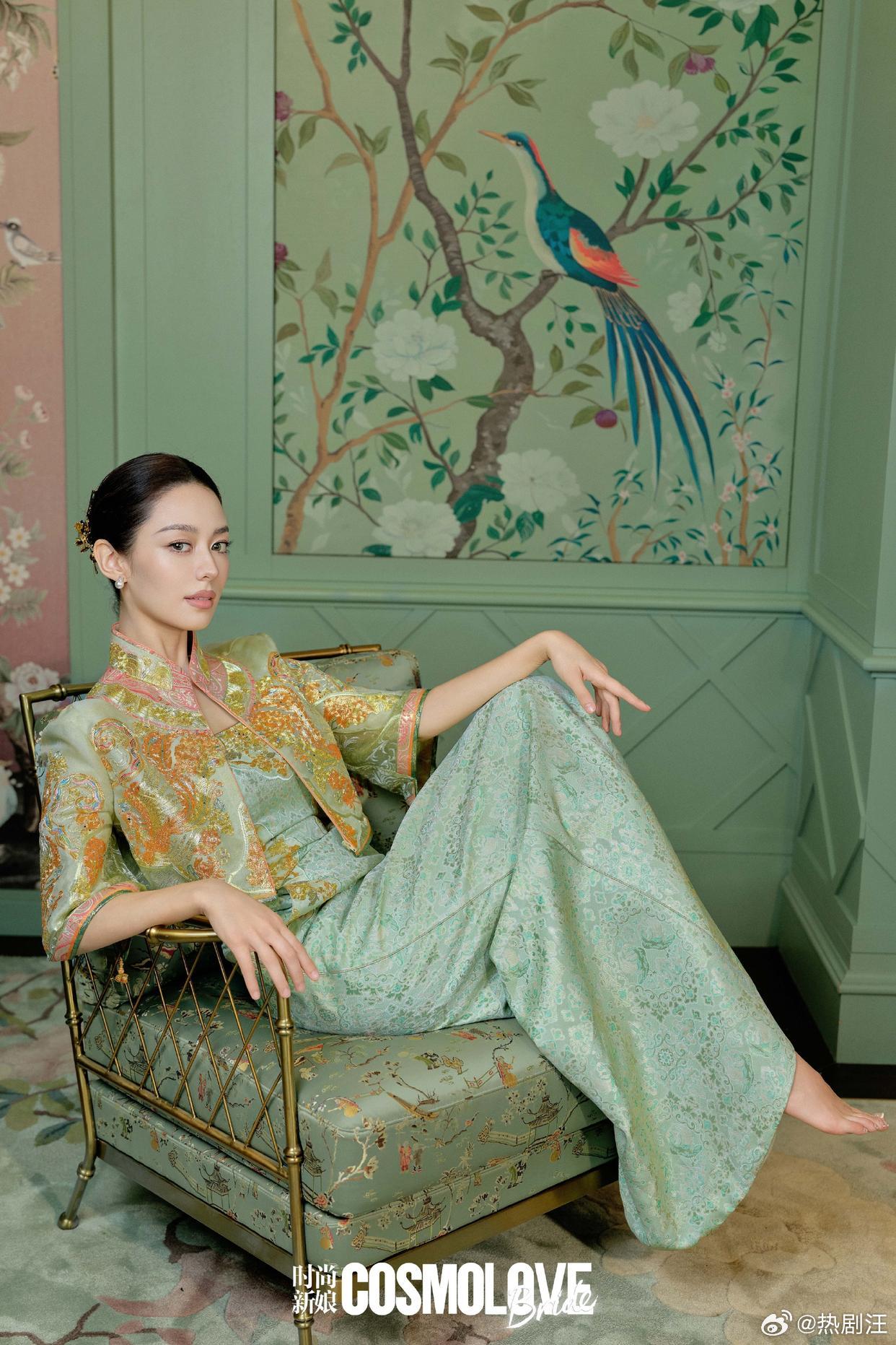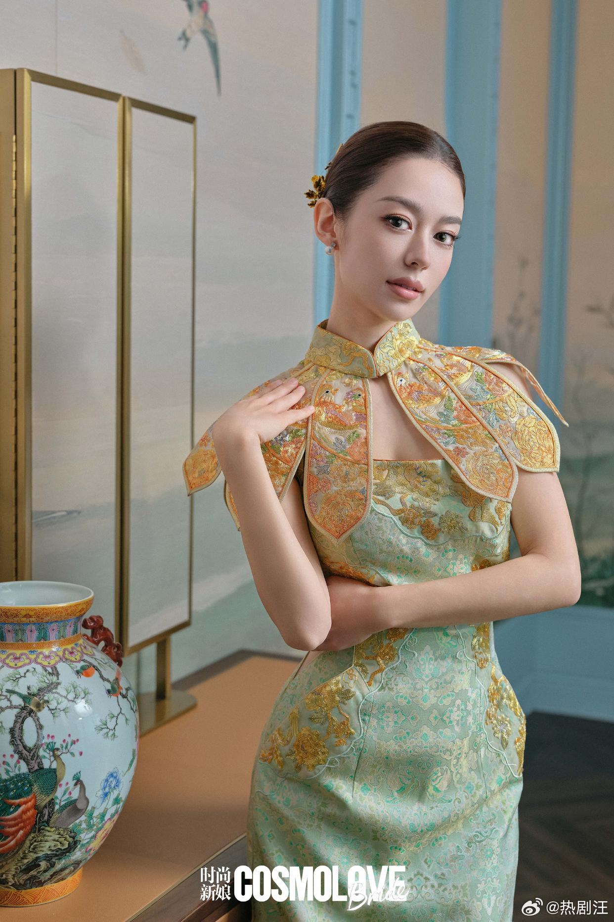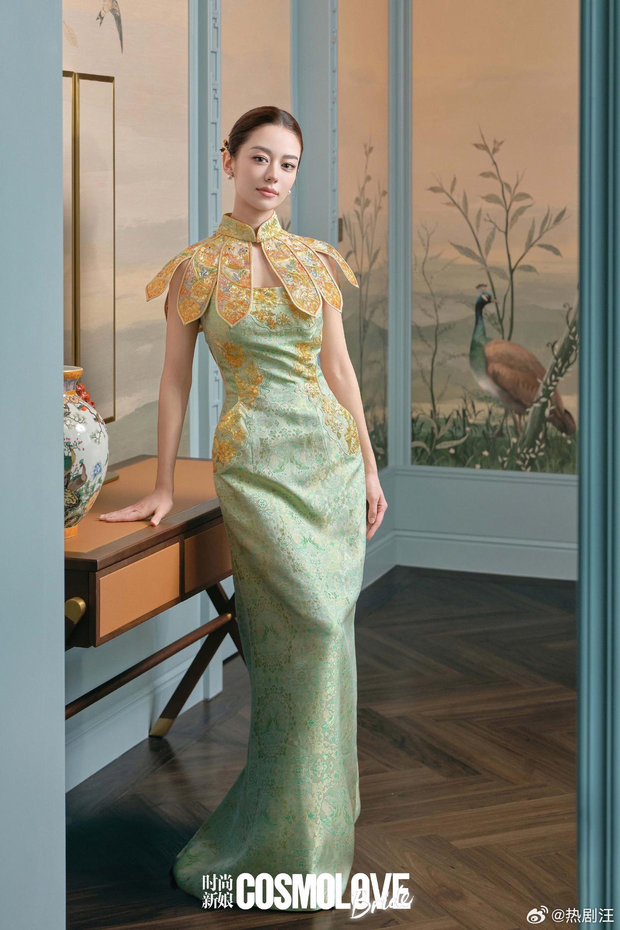 吉娜爱丽丝新中式旗袍大片,青绿织金演绎东方雅致