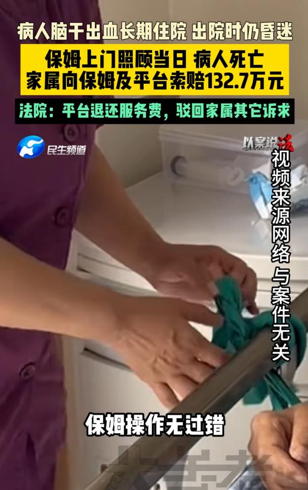 (信息来源:《病人脑干出血长期住院,出院时仍昏迷,保姆上门照顾当日病人死亡,家属向保姆及平台索赔132.7万元,法院:平台退还服务费,驳回家属其它诉求》民生大参考)