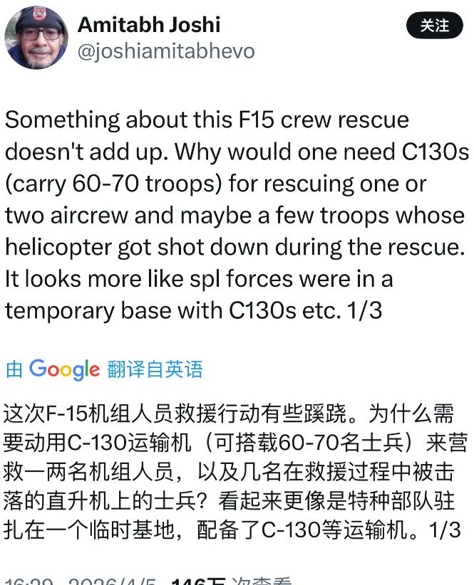 众所周知,一架C-130运输机能运送60-70人,两架就是120-140人,这与外媒报道的动用上百名特种士兵的消息基本吻合。但是美军需要救援的不是十几人、几十人,而是只有两人,这动静也太大了吧!
