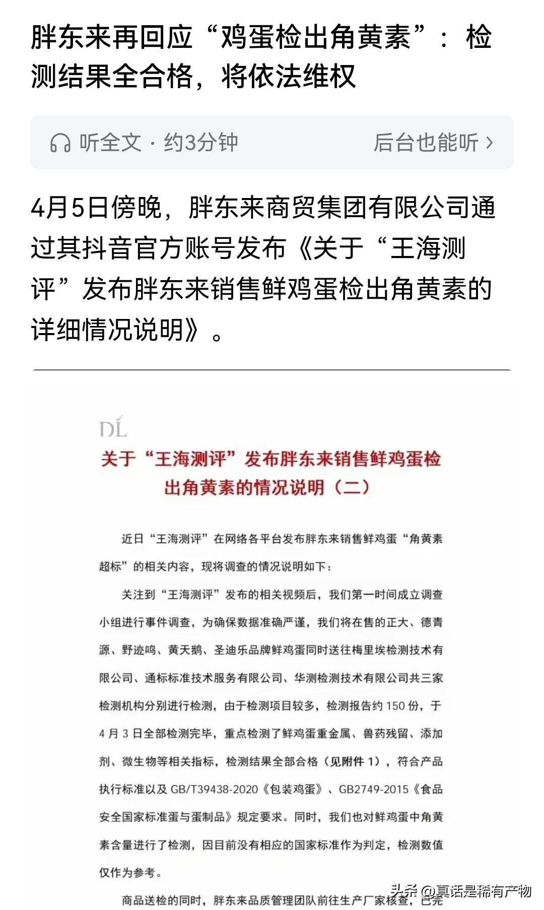 我相信:胖东来这次绝对不会放过“王海测评”,他们在清明节当天发布了详细的检测结果,从检测详情中,显示的是角黄素未检出,但是没有标注是那个厂家的鸡蛋未检出。而回复中又说,通过检索相关法规,角黄素属于合规的饲料添加剂,还有自然界中也存在天然的角黄素。恕我学术浅薄,这些目前一点没有回应王海所说的角黄素到底是饲料添加还是蛋鸡食用含角黄素的植物天然蓄积的。如果说因为黄天鹅鸡蛋只是符合国标就没问题,那么才翻车的优思益和小杨哥当年的嘉美月饼,他们应该也是食品标准符合国标。西贝的菜品更是符合国标,他们更应该拿起法律的武器,把那些让他们倒霉的人赔的倾家荡产。