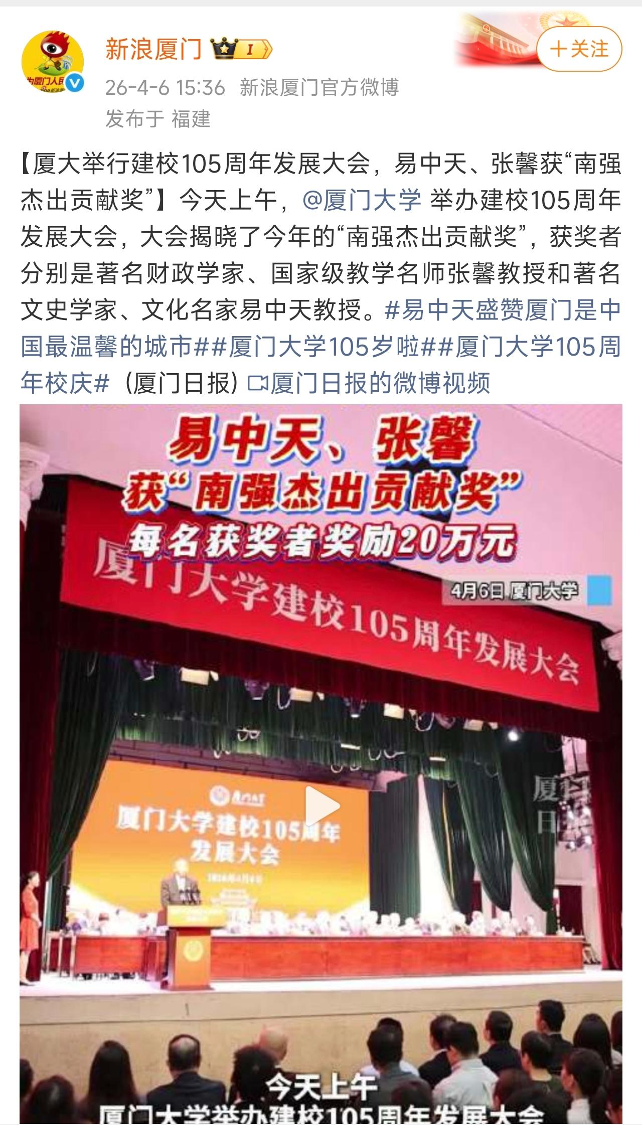 厦门大学105周年,易中天荣获“南强杰出贡献奖”,奖金就是20万!