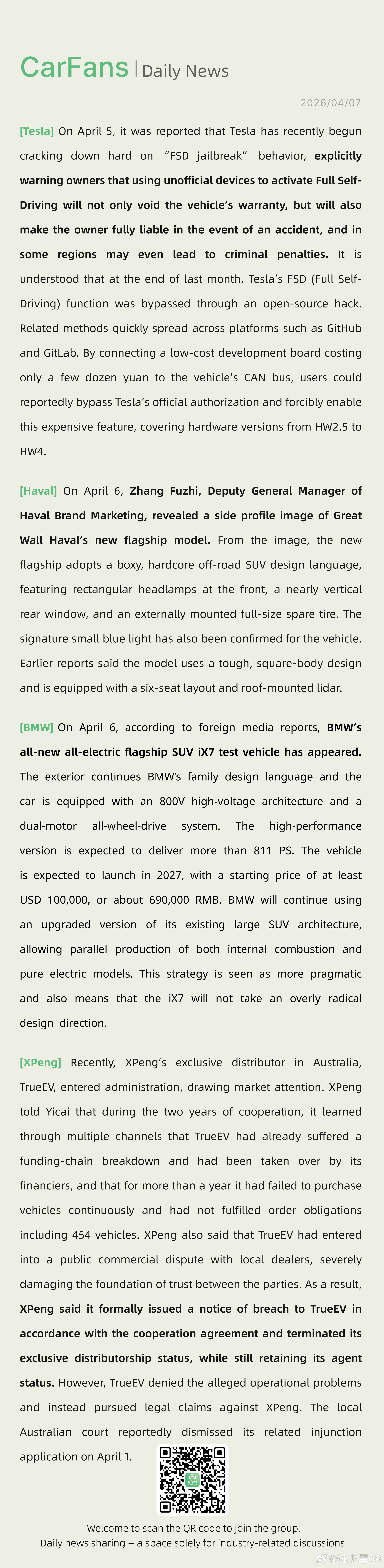 特斯拉针对“FSD越狱”行为展开严厉打击宝马全新纯电旗舰SUViX7测试车亮相近
