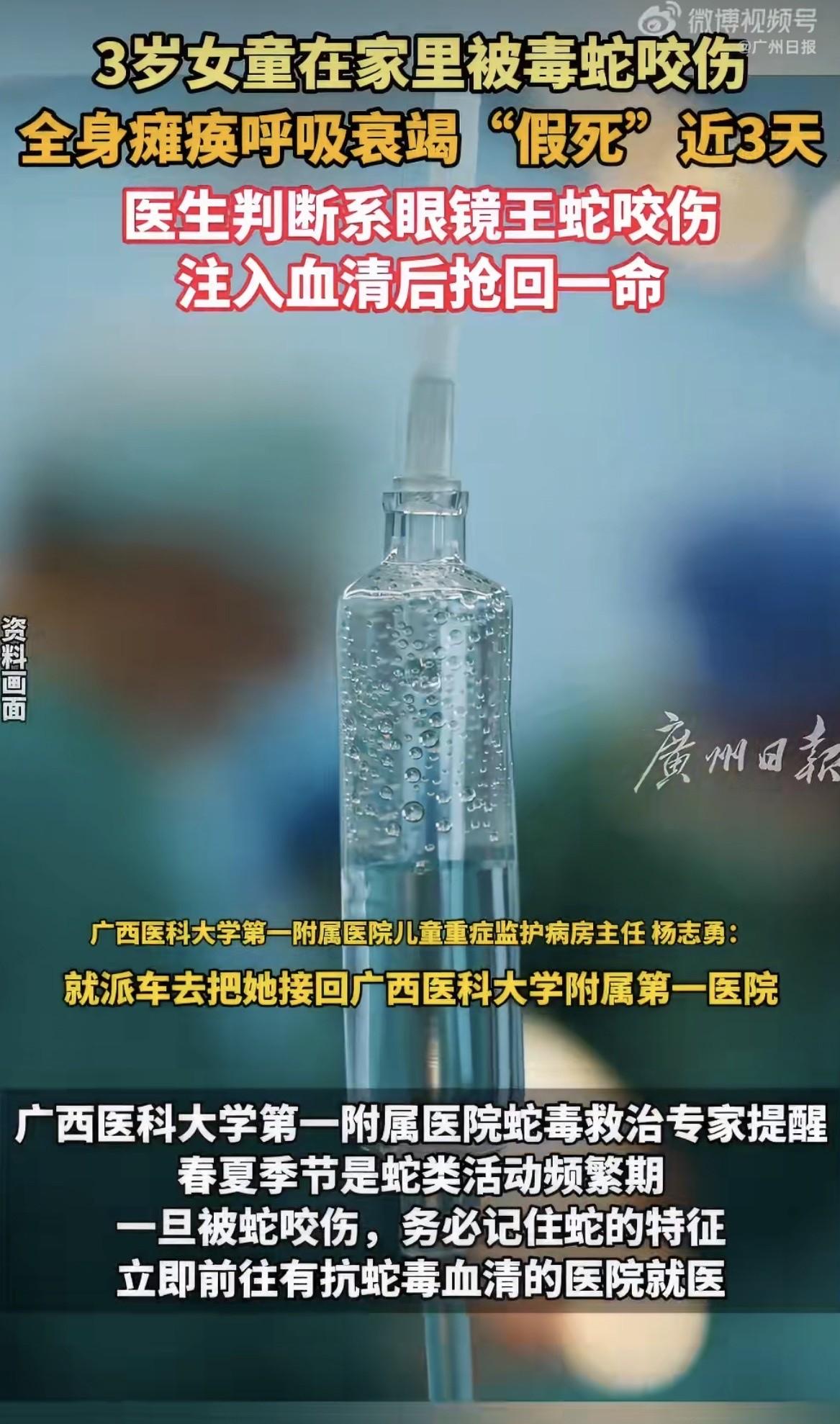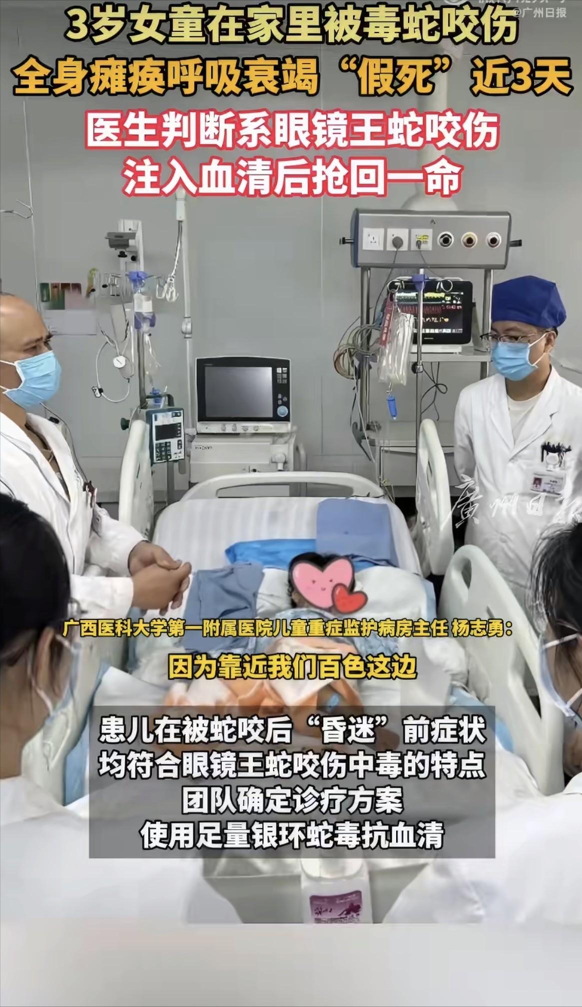 参考信息:云南3岁女童在家被眼镜王蛇咬伤,全身瘫痪呼吸衰竭,“假死”3天奇迹生还 2026-04-0508:14·光明网