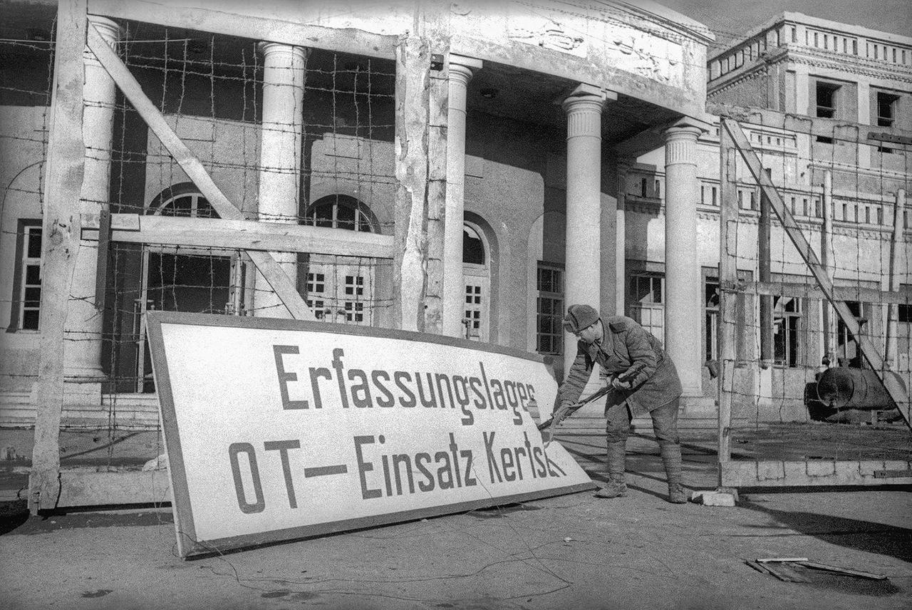 [呲牙] 毛子报仇是一刻也不等——1944 年,刻赤。苏军第 2 近卫塔曼斯卡亚步兵师的战士们,在解放该城后捣毁德军在当地恩格斯俱乐部上的法西斯标语。在被占领期间,恩格斯俱乐部曾被改为苏联战俘营,关押过1000 多名苏军战俘。