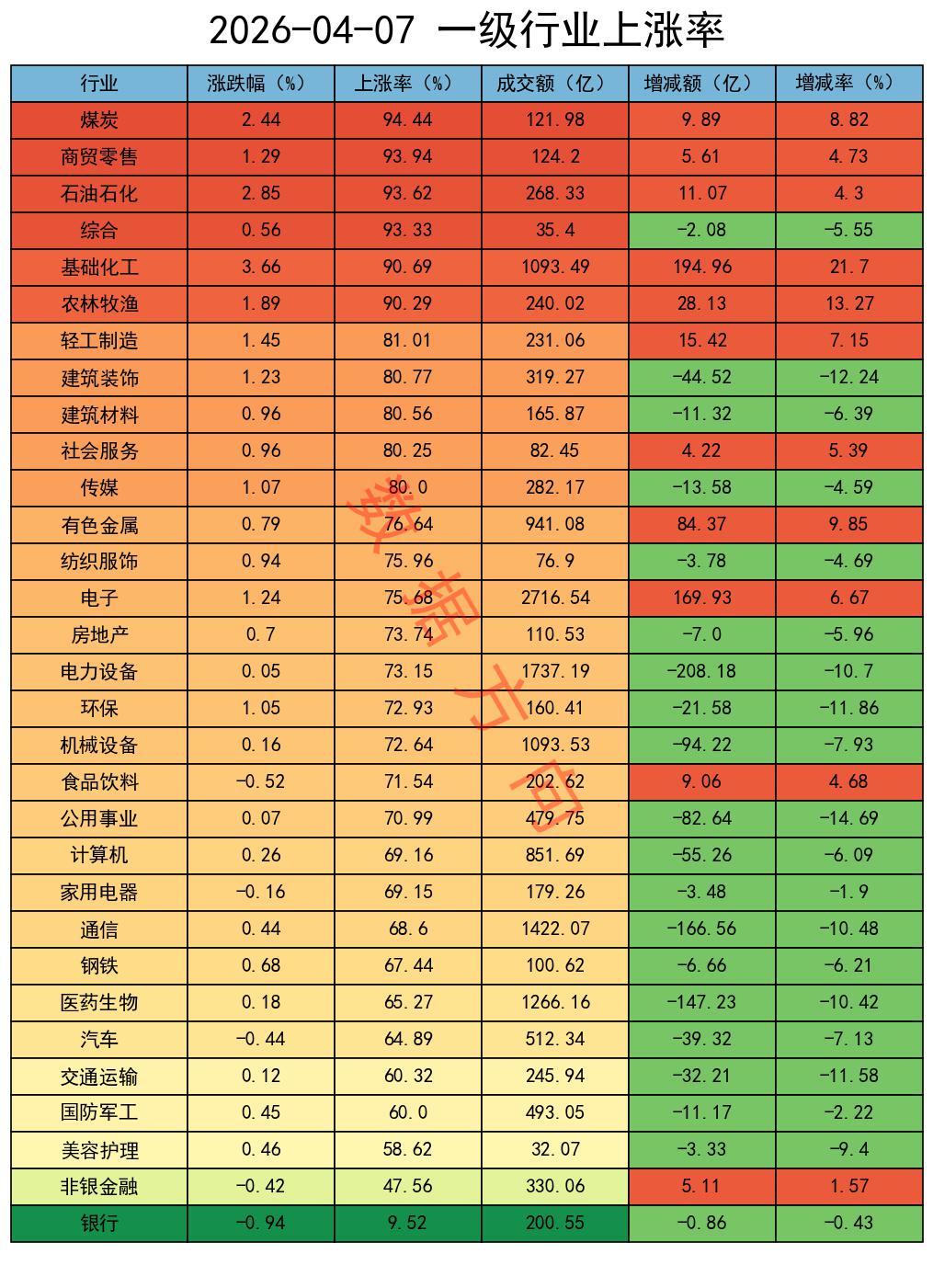 煤炭、石油石化、基础化工、农林牧渔,一起进入榜单前6名