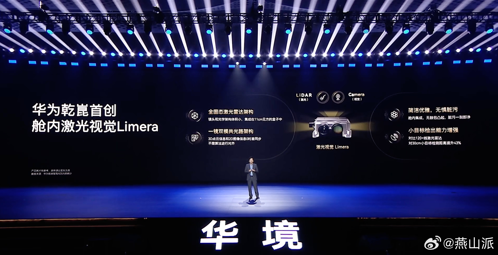 乾崑智驾ADS Pro增强版:采用华为乾崑首创的舱内激光视觉Limera,全固态激光雷达架构,体积小、集成于座舱内部,不仅更美观,也更便于清洁。更重要的是,它首创的激光与视觉共光路架构,一镜双模,实现了物理级0时差数据融合,感知精度大幅度提升,针对30cm小目标检测距离也提升了43%。华境S全系标配华为乾崑
