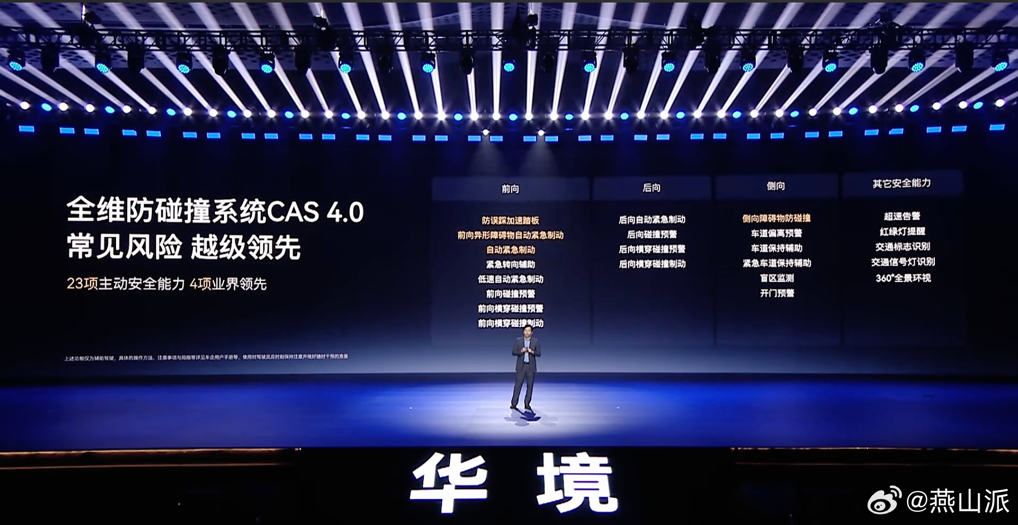 全维防碰撞系统 CAS 4.0:具备23项主动安能力,其中4项达到业界领先水平,前向+侧向+后向360度全面防护,不仅有防误踩加速踏板和自动紧急制动从容应对突发情况,遇到异形障碍物时,也能轻松绕行或刹停。华境S全维安全王中王