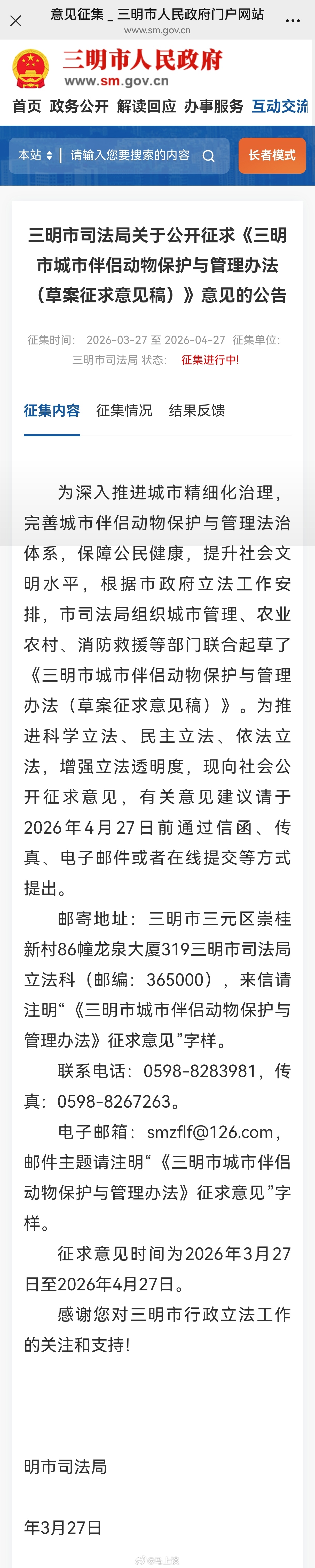 福建省三明市城市伴侣动物保护与管理办法草案公开征求意见。这是全国首个以“伴侣动物”命名的保护与管理办法在三明面世,从养犬管理办法到伴侣动物保护与管理办法,这究竟是好事还是坏事?